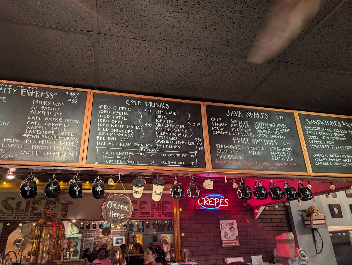 “ This "House of Java" is a cozy local establishment with "Central Perk" vibes, freshly baked goods, and a few sandwiches and crepes made to order. This local college hangout is great for getting some work done with an eclectic atmosphere, some comfortable chairs and sofas, cheap’ish eats, and free wifi with purchase. Everything on the menu looked good, but I'll admit the Pumpkin Latte was terrible, so maybe that's bad luck, or people go for the price and the atmosphere and not the java? Beware the men's bathroom; it smells like a jock's strap, which is to say, bad enough to turn your stomach. Other than the smell, the bathroom was reasonably clean but shabby. The staff was friendly, but the trash overflowed the cans for hours. If you're going to hang out with friends and co-workers or get some work done, this is a pretty cool spot. Regarding the Food and Java, YMMV. ”